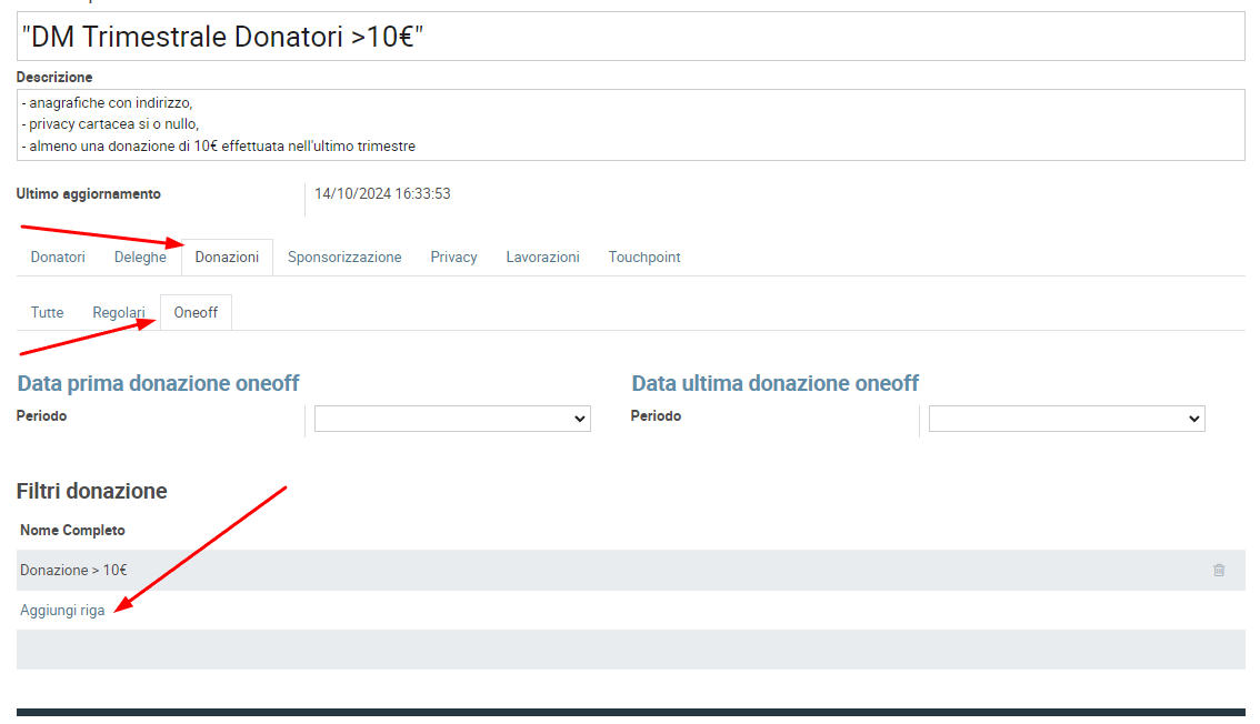 A questo punto ti si aprirà una nuova schermata in cui puoi inserire i criteri per aggiungere al segmento tutti i donatori che negli ultimi 24 mesi (o nel parametro da te definito) hanno effettuato almeno una donazione di importo secco da almeno 10 euro andata a buon fine.