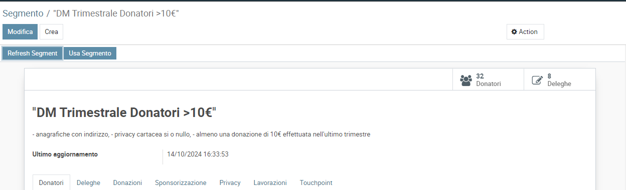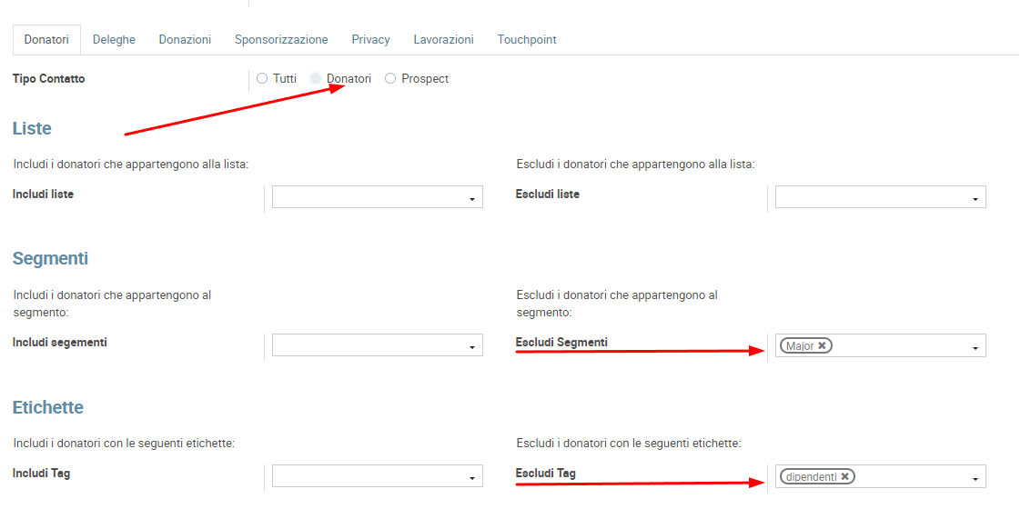 1) Verificare che il tipo di contatto sia effettivamente donatori e poi per prima cosa attraverso le funzioni Escludi Segmenti e Escludi Etichette puoi lasciare fuori dal segmento alcune categorie di donatori che non sono i destinatari di questo tipo di azione.