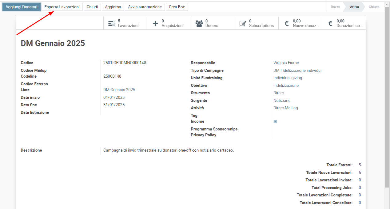 Clicca su Attiva in alto a Sinistra e il sistema in automatico creerà tante lavorazioni quanti donatori sono stati coinvolti, ovvero tanti donatori quanti quelli contenuti nella lista di riferimento.