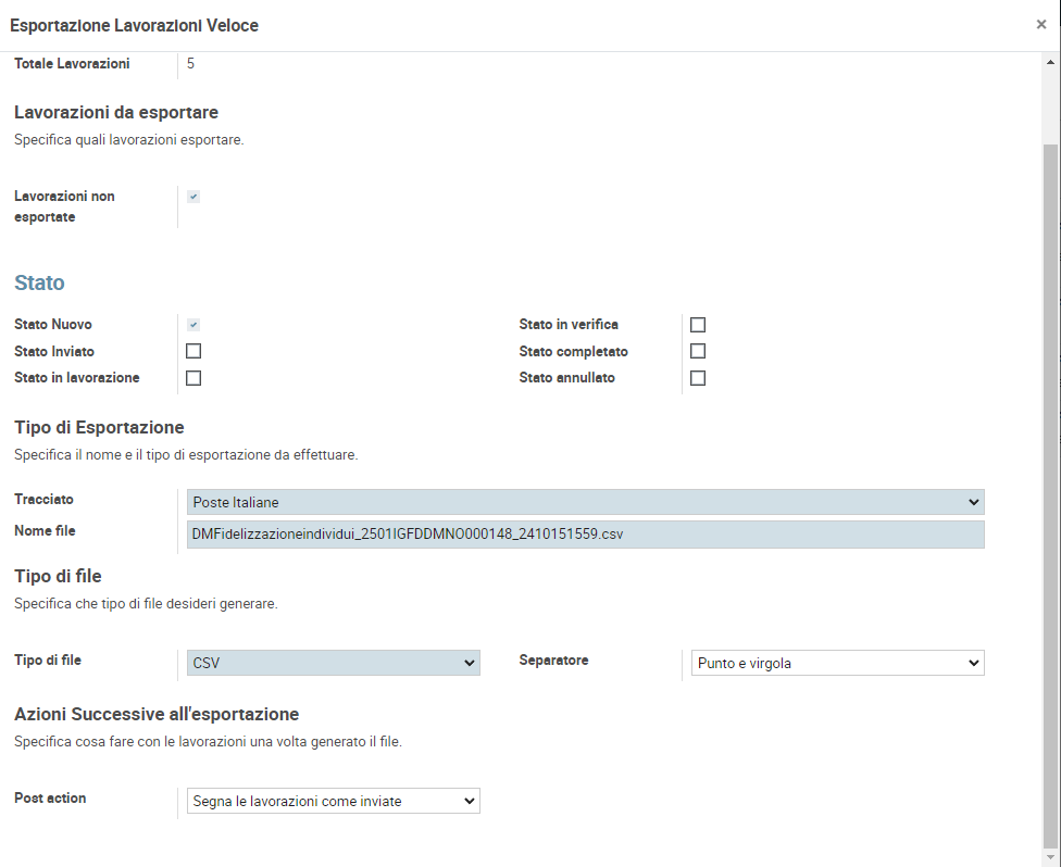 L'opzione "segna lavorazioni come inviate" è pensata per i casi in cui le lavorazioni devono rimanere in stato Inviato, per poterle poi chiudere successivamente (indicato per le campagne di telemarketing);