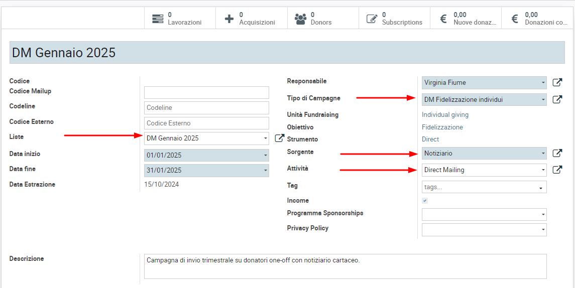 Immaginiamo che la tua strategia di fundraising preveda un invio periodico di Direct Mailing a tutti i donatori esistenti nel tuo database. Ti servirà identificare donatori che abbiano criteri come: