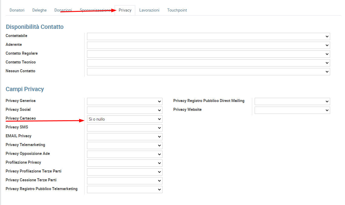 Nel tab Privacy puoi dunque andare a indicare che il segmento deve contenere solo le anagrafiche di persone che abbiano la Privacy Cartaceo impostata su 'sì' o 'nullo'.