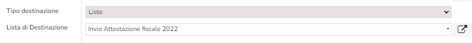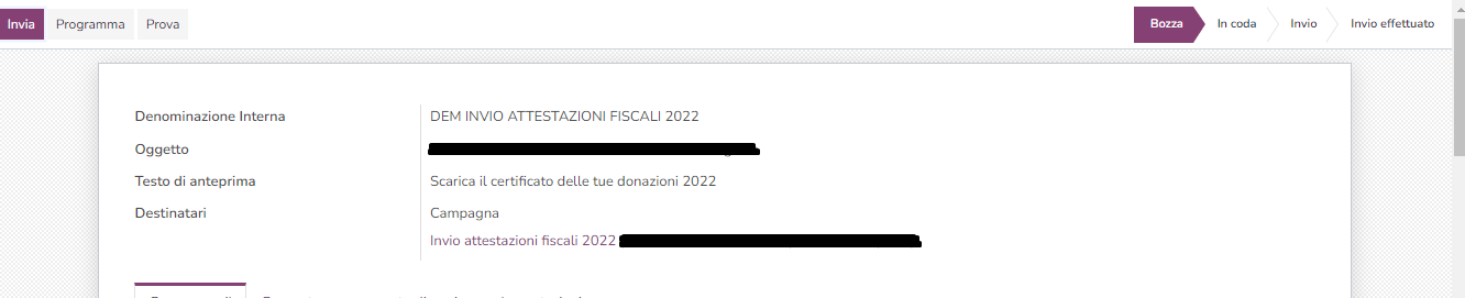 Crea la campagna con la tipologia adeguata (ogni organizzazione ha le sue tipologie) e aggiungi i donatori della lista appena creata tasto aggiungi donatori>lista "invio attestazioni fiscali XXXX" >edit target