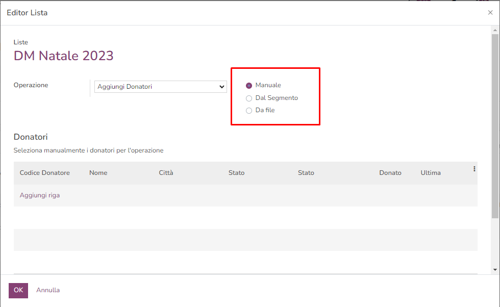 - manuale: aggiungendo a mano i donatori cliccando si "aggiungi riga" nel campo sottostante;