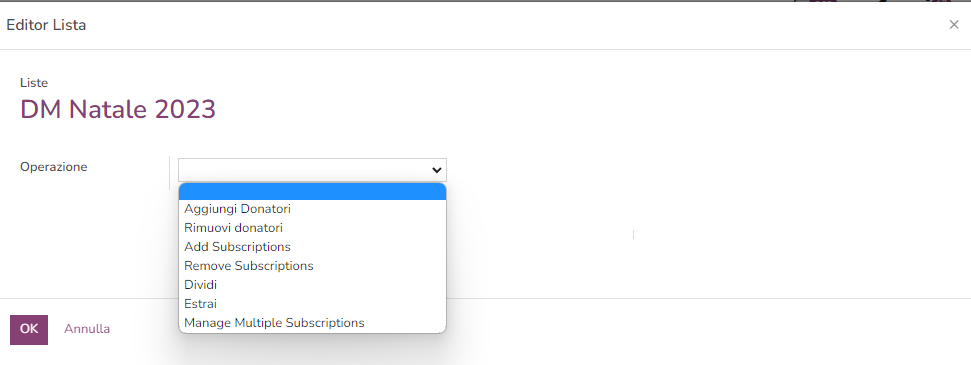 Per svuotare una lista hai più opzioni, esattamente come per popolarla, solitamente la scelta più comoda è riprendere l'operazione che avevi usato per popolare la lista (quindi se avevi usato un segmento, puoi scegliere il segmento per svuotare la lista; se avevi usato un file con i codici donatori stessa cosa).