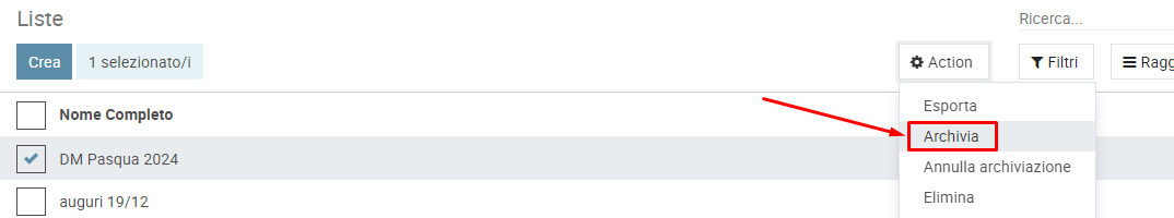 Per riportare come attiva una lista archiviata, seleziona la lista > pulsante Action > Annulla archviazione