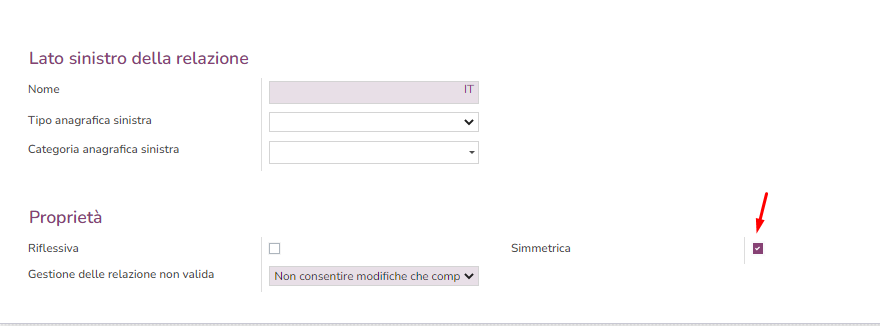 Flaggando la spunta Simmetrica, la parte destra della relazione viene disabilitata; in questo caso quindi, deve essere indicato un solo nome per la relazione che è valido per entrambe le anagrafiche coinvolte, ad esempio Coniuge di