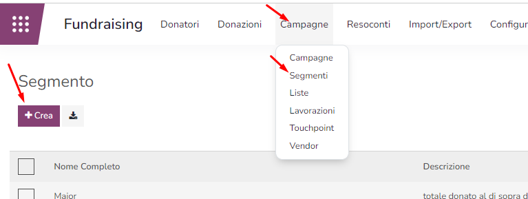 Per creare un segmento vai nell'App fundraising, clicca su campagne>segmenti>crea