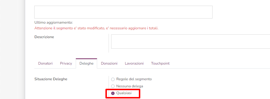 - "Regole del segmento": i donatori che estrai sono l'intersezione fra quelli che corrispondono ai filtri "Donatori" e i donatori collegati alla delega