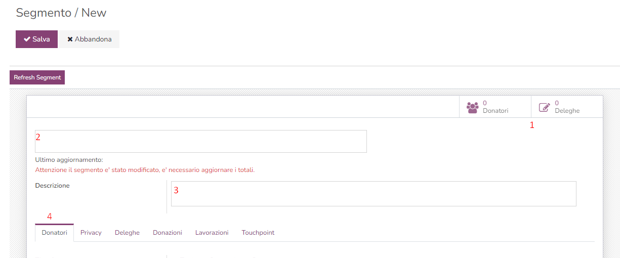 - Contatori: In alto a destra (numero 1), puoi visualizzare i contatori dei donatori e delle deleghe che ti indicheranno quanti record avrai incluso nel segmento dopo aver inserito le regole di riferimento.