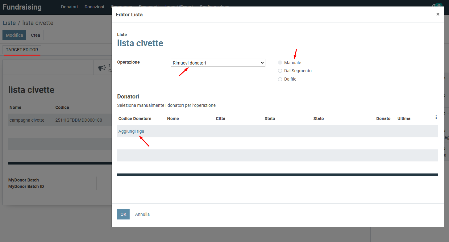 - manuale: aggiungendo a mano i donatori cliccando si "aggiungi riga" nel campo sottostante;