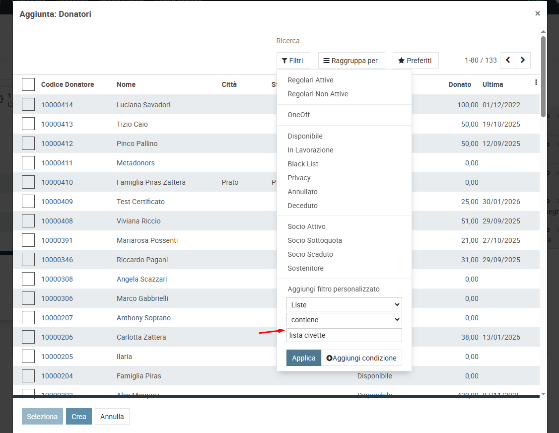 Con questa scelta, si apre una finestra dove puoi applicare il filtro "Liste contiene NOME LISTA"