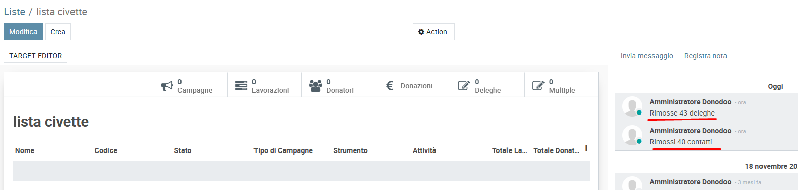Per svuotare una lista hai più opzioni, esattamente come per popolarla, solitamente la scelta più comoda è riprendere l'operazione che avevi usato per popolare la lista (quindi se avevi usato un segmento, puoi scegliere il segmento per svuotare la lista; se avevi usato un file con i codici donatori stessa cosa).