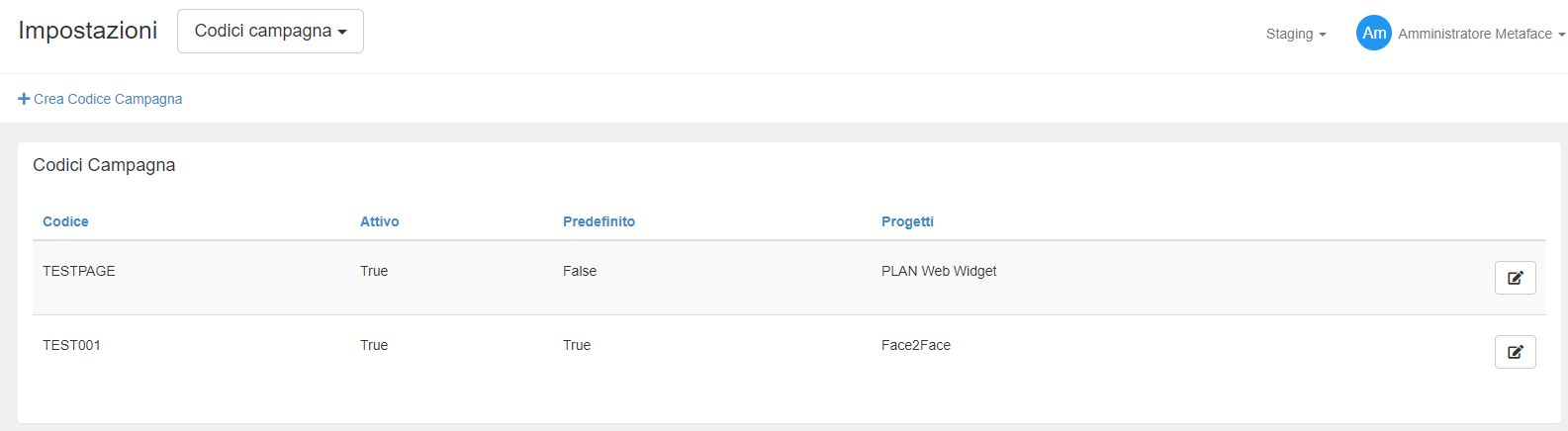 La gestione dei codici campagna all’interno di tutti i progetti Metaface è raggruppata in una singola schermata di impostazione, in modo che possa facilmente essere gestita senza spostarsi da un progetto all’altro.