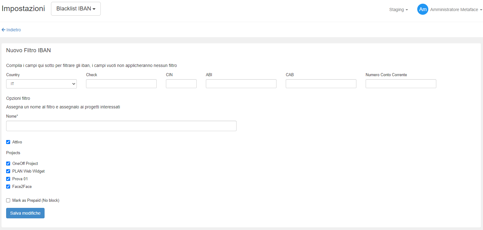 Potete gestire in questa sezione gli IBAN indesiderati ed assegnarli direttamente a tutti i progetti (o solo ai progetti desiderati).