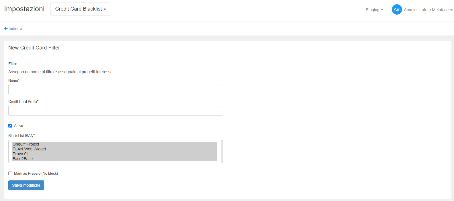 Stessa logica all'interno della Credit Card Blacklist dove potete indicare il prefisso delle carte che non volete accettare per le transazioni e scegliere a quale progetti collegare il filtro.