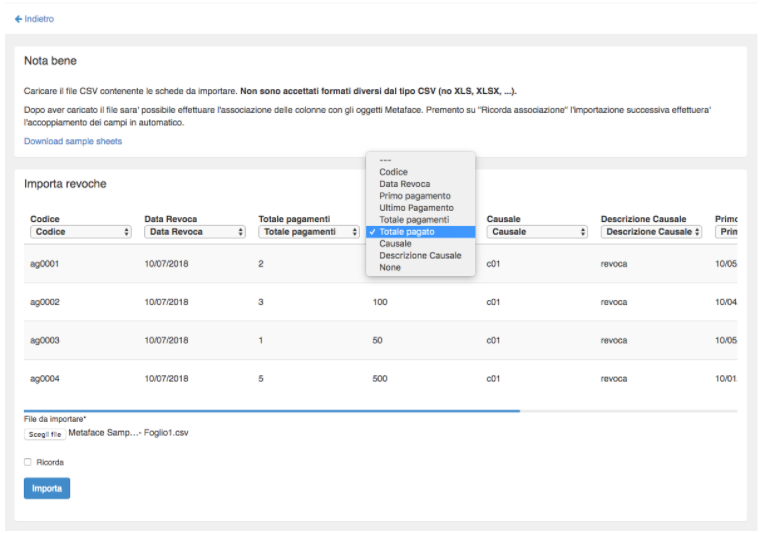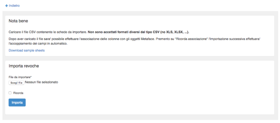 La procedura di importazione revoche da file .csv è disponibile su Metaface a questa URL: